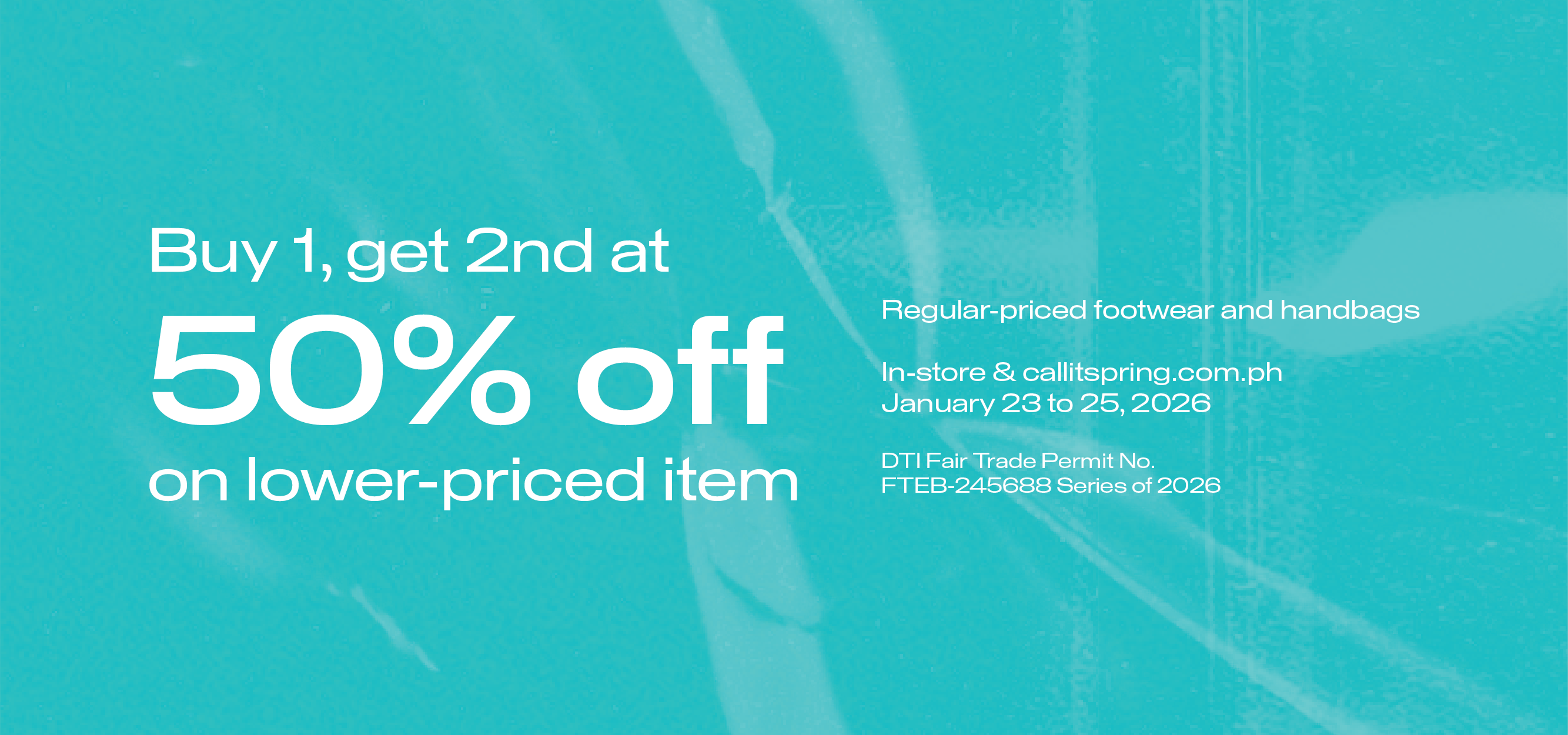 Buy 1 and get the 2nd item for 50% off. Promo valid on regular-priced styles from January 23-25, 2026, in-store and online. Discount is automatically applied on the lower-priced item at checkout. DTI Fair Trade Permit No. FTEB-245688 Series of 2026