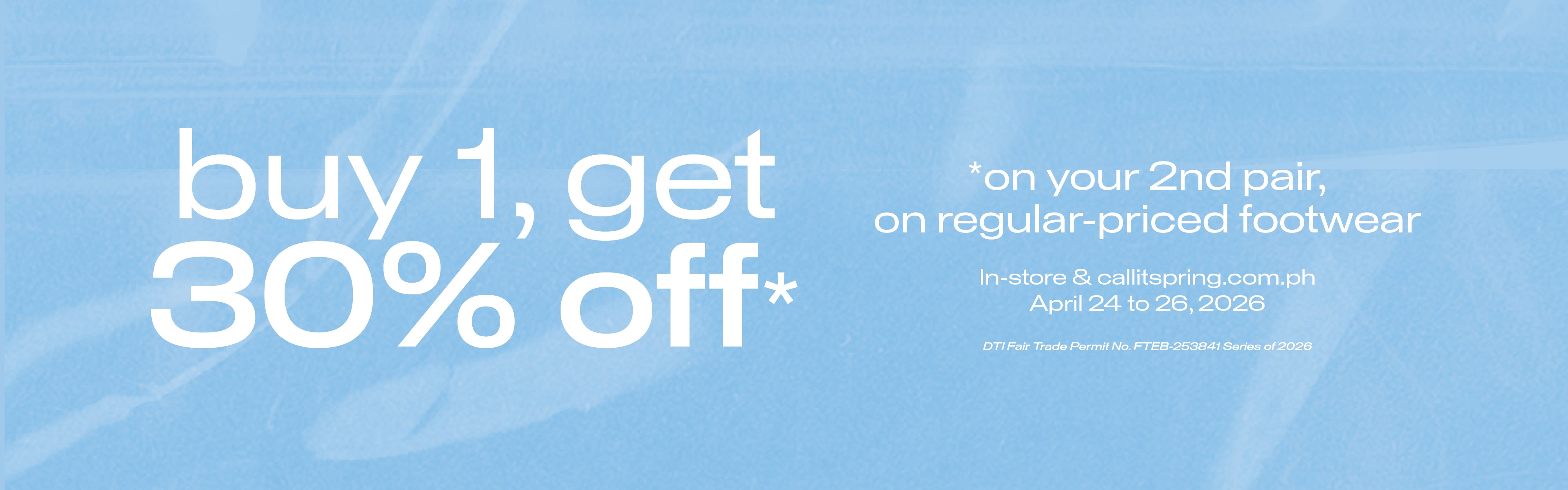 Buy 1, get 30% off on your second pair. Valid on all regular-priced footwear. Discount is automatically applied on the lower-priced item at checkout. Promo runs from April 24-26, in-store and online.